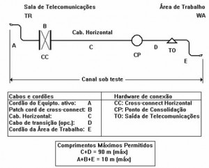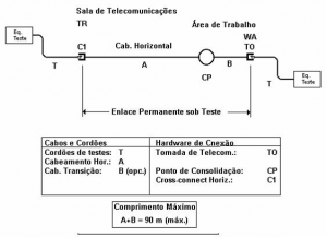 Para a execução de testes de certificação do cabeamento instalado existem dois tipos de configuração para medição, o Enlace Permanente (Permanent Link) e Canal (Channel). Portanto, a configuração de Enlace Básico (Basic Link) não é mais uma configuração reconhecida para teste do sistema desde a publicação da norma da Categoria 5e. As figuras 1 e 2 mostram ambas as configurações de testes reconhecidas para Cat. 5e, 6 e 6a. É importante notar que na configuração de teste segundo o modelo canal, todos os cordões de manobra (patch cords), assim como o cordão do usuário na área de trabalho são considerados. No entanto, o modelo de enlace permanente considera apenas o cabeamento horizontal sem incluir os cordões de manobra, de equipamentos e da área de trabalho. Os testes de certificação, neste caso, devem ser executados com os adaptadores e cordões fornecidos pelo fabricante do equipamento de teste utilizado.