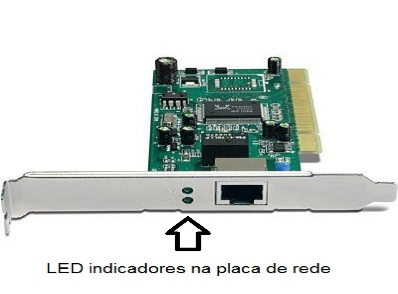 Um outro processo simples para verificar o funcionamento da rede é através dos LED indicadores, quer da placa de rede, quer do hub ou switch. Normalmente as placas de rede têm um ou mais LED que nos poderão indicar como está a atividade da rede – quando existe uma ligação entre a placa e um hub ou switch acende-se um LED, normalmente verde, na placa de rede; esse LED geralmente fica permanentemente ligado. Na grande maioria das placas existe também um segundo LED, que pode ser verde ou amarelo, e que acende quando existe tráfego na rede, daí que seja normal piscar. Podemos ainda encontrar um terceiro LED, que pode ser vermelho ou amarelo, e que indica se existem colisões na rede (Figura 8.1).