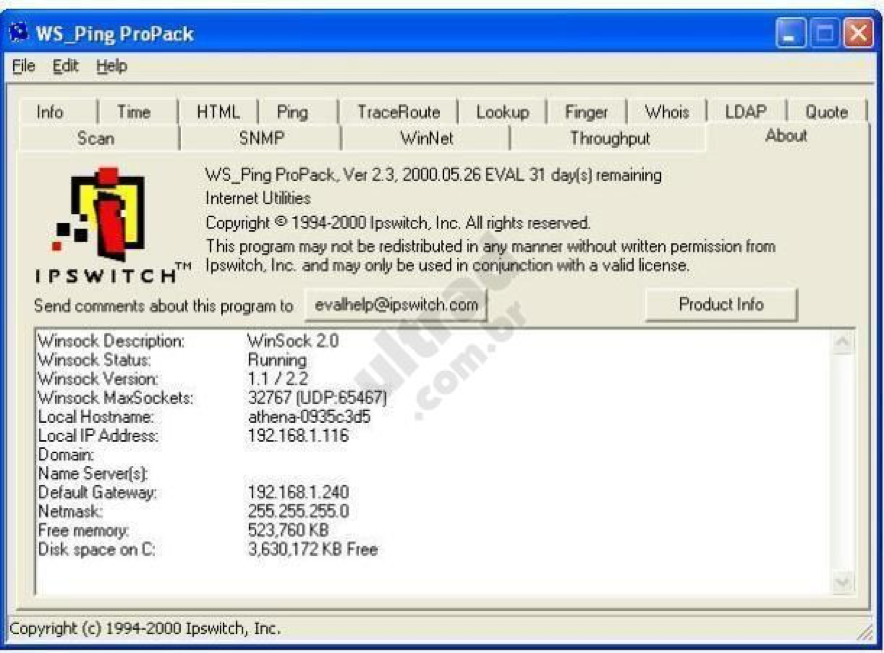 Um dos utilitários que se pode mostrar muito útil é o WS_Ping ProPack da ipswitch (www.ipswitch.com) (Figura 8.18). É um conjunto de ferramentas de informação e diagnóstico quer para Internet quer para redes. Neste utilitário temos um ambiente gráfico com as ferramentas mais utilizadas, tais como: ping, traceroute, DNS Lookup, finger, Whois, LDAP e ferramentas SNMP. Este conjunto de ferramentas ajuda a detectar rapidamente problemas de rede e encontrar informações acerca dos usuários, hosts e redes na Internet ou numa Intranet. Além disso, permite também testar endereços web, sincronizar o computador com um servidor de horas e testar a velocidade de uma ligação.