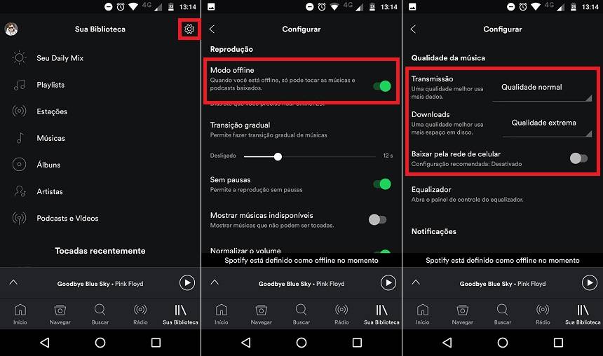 Ative o “Modo offline” para evitar download quando não estiver conectado no Wi-Fi. Para alterar o tamanho das músicas, basta ir em “Qualidade da música”. Desative também a opção “Baixar pela rede do celular”.