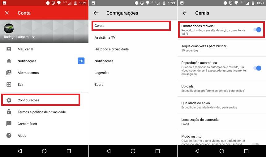 Configurações > Gerais > Limitar dados móveis. Isso diminuirá a qualidade de vídeos quando não estiverem conectados no Wi-Fi.