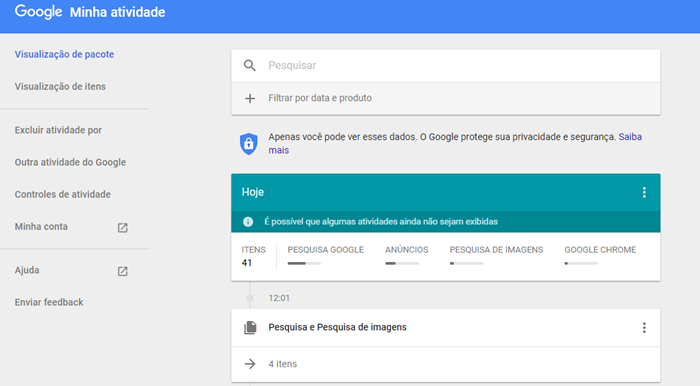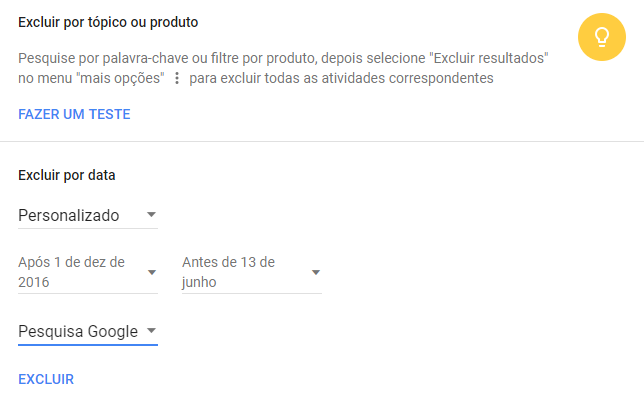 2. Clique em “Excluir atividade por”, no painel à esquerda. Você pode definir produtos e datas de início e fim. Depois, é só clicar em “Excluir”. Também é possível excluir todo o conteúdo.