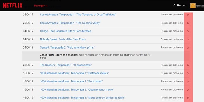 Passo 3. Uma lista com tudo o que foi assistido será exibida. Para apagar algum item, basta clicar sobre o “X” à direita do título. No caso de uma série, é possível escolher a opção “Remover série”.