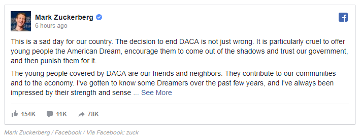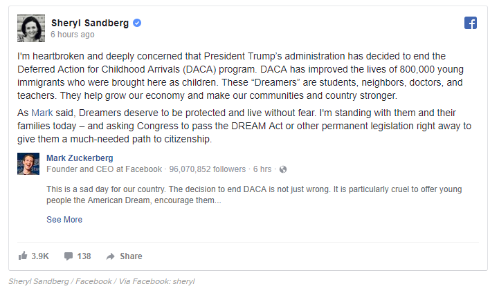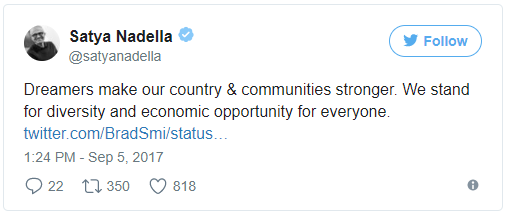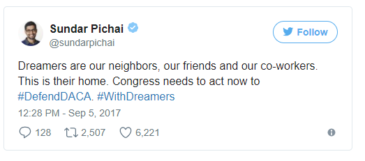 Susan Wojcicki, CEO do YouTube, que faz parte do Google, também certou : “Estou triste por essa decisão, eles são nossos amigos, vizinhos e colegas de trabalho. O Congresso deve fazer o que é certo: proteja os Sonhadores #DefendDACA”