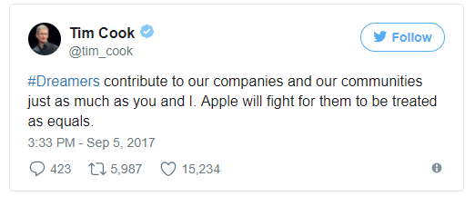 O CEO da Apple, Tim Cook, também se pronunciou pelo Twitter. E em uma carta aos funcionários, declarou “Os sonhadores que trabalham na Apple podem ter nascido no Canadá, no México, no Quênia ou na Mongólia, mas a América é a única casa que já conheceram. Eles cresceram em nossas cidades… Eles contribuem para nossa empresa, nossa economia e nossas comunidades tanto quanto você e eu. Seus sonhos são nossos sonhos.”