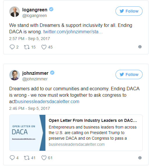 O CEO da Uber, Dara Khosrowshahi, publicou em seu Twitter, “é contra nossos valores virar as costas para #DREAMers. Todos merecem uma chance de trabalhar, estudar e contribuir – o #AmericanDream!”