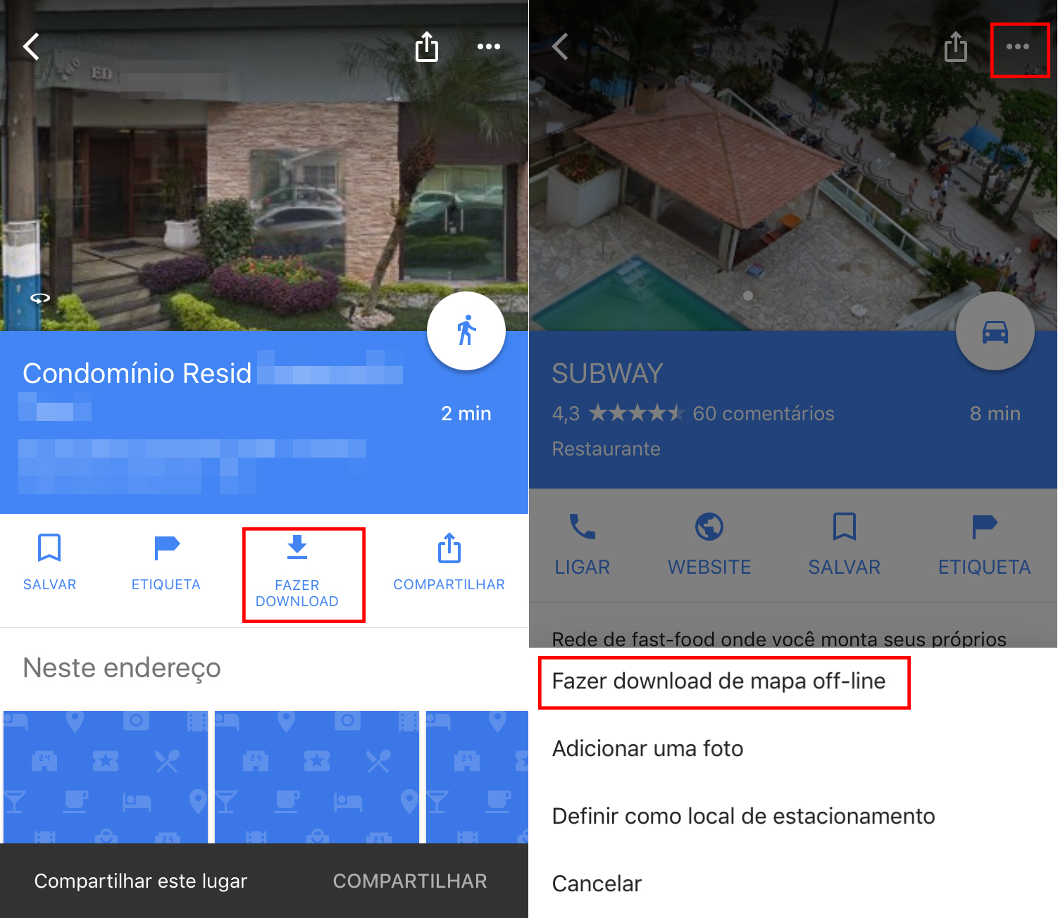 Se a opção não aparecer, toque no ícone de três pontos no canto superior direito e depois em “Fazer download de mapa off-line”.
