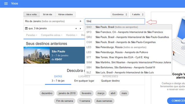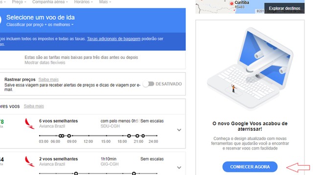 Passo 2. No lado direito da tela, um aviso diz que um novo Google Voos acabou de aterrisar. Clique em “conhecer agora”.
