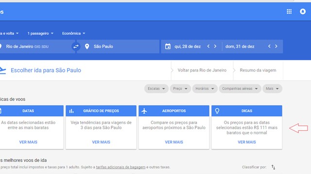 Passo 3. Na aba “Dicas”, será exibido um aviso se o preço estiver mais barato que o normal para o período, comparando com o último ano. Ao lado, todos os outros recursos disponibilizados pela Google no celular também aparecem na web, como: ver as datas mais baratas para a viagem, o gráfico de preços para a quantidade de dias desejados, comparação com outros aeroportos, entre outras dicas (o que fazer na cidade de destino, por exemplo).