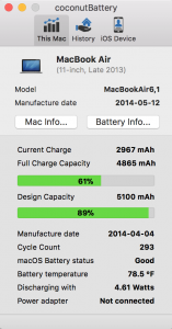 Este programa só está disponível para Mac. Bastante parecido com o iMazing, o Coconut Battery precisa apenas da conexão do iPhone com o Mac via USB para mostrar a capacidade da bateria e a contagem de ciclos de carregamento.