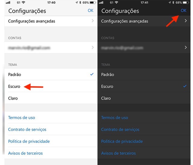 Passo 2. Nas opções de tema, toque em “Escuro”. Feito isso, o modo escuro será ativa e você pode efetivar a alteração tocando na opção “OK”, no canto superior direito da tela.