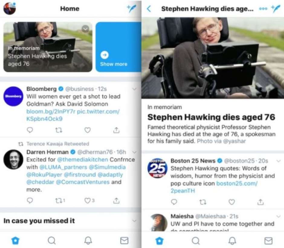 Twitter está estudando a inclusão de um bloco de notícias no topo da linha do tempo dos usuários de sua versão mobile. O recurso, ainda em fase de testes, chegaria para expandir o caráter noticioso da rede social, entregando aos usuários, logo de início, informações sobre grandes eventos ou assuntos que estejam gerando comoção, de forma a aumentar o engajamento e também o tráfego de serviços considerados relevantes para a comunidade.